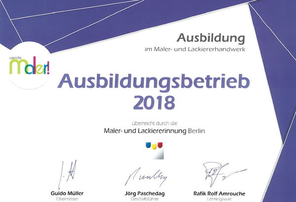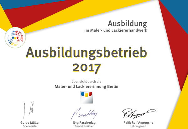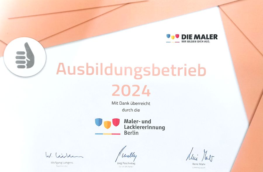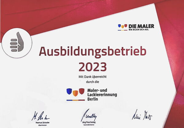Auch in diesem Jahr wurde erneut die Auszeichnung „Ausbildungsbetrieb 2024“ von der Maler- und Lackiererinnung Berlin vergeben. Diese Anerkennung würdigt das fortwährende Engagement im Bereich der Ausbildung junger Menschen im Maler- und Lackiererhandwerk und unterstreicht die wichtige Rolle, die Unternehmen in der Förderung des Handwerksnachwuchses spielen.