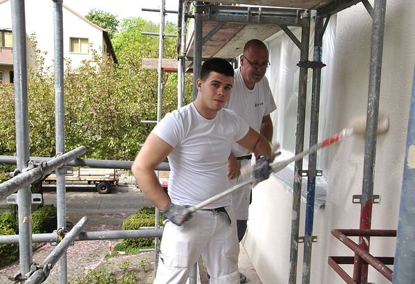 Kevin Lutter, Praktikant im betriebsvorbereiteneden Jahr, wird von Lehrlingswart Eric Rittmeyer bei Anstricharbeiten für Fassadenbeschichtung eingewiesen.