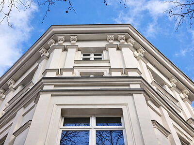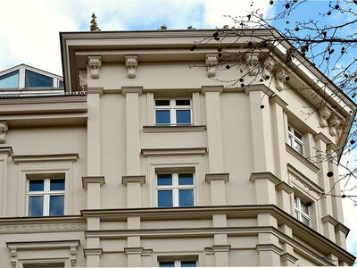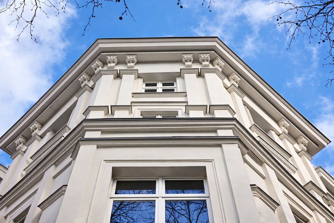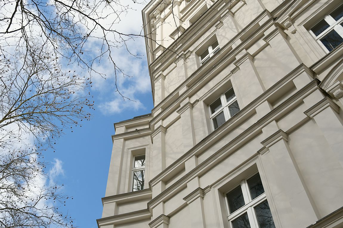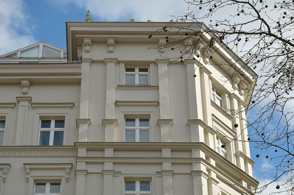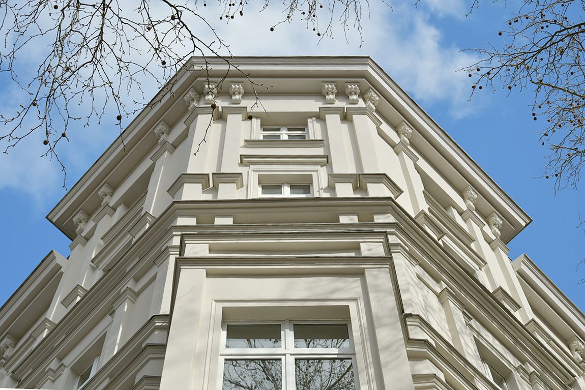Besonderes Augenmerk lag auf der sauberen Herausarbeitung von Kanten, Übergängen und Profilen, die das Erscheinungsbild eines Berliner Altbaus wesentlich prägen. Durch eine präzise handwerkliche Ausführung entstand eine ruhige, hochwertige Oberfläche, die die klassische Fassadenarchitektur des Gebäudes wieder deutlich hervorhebt.