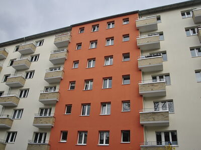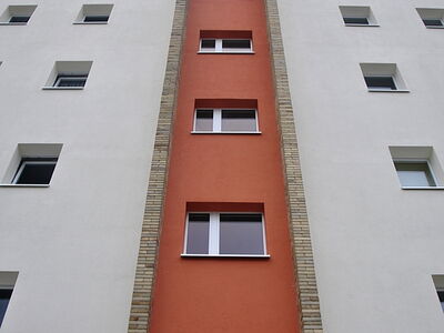 Die freundliche und klare Gestaltung des Mietshauses in Berlin-Wilmersdorf besticht durch die in oxIdrot abgesetzten, geschoßhohen Farbflächen. Diese klare Gestaltung überzeugte die Jury. Die Einbindung der Balkone in die Gesamtgestaltung ist sehr gut gelungen. Die handwerklich und technisch einwandfreie Ausfüührung unterstreicht die neue Farbigkeit des Gebäudes.