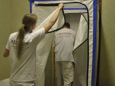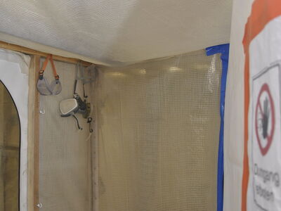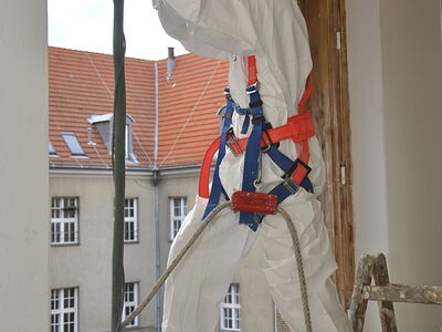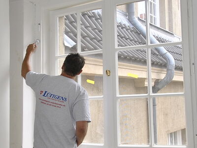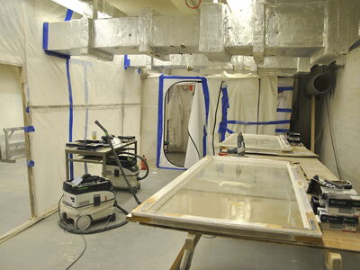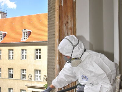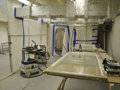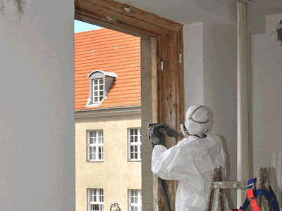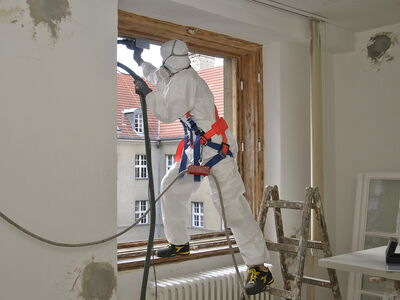 Im Rathaus Schöneberg wurden umfänglich Kastendoppelfenster saniert. Dabei wurden die Fenster vollständig mit Heißluft abgebrannt, anschließend geschliffen, grundiert und neu lackiert. Die Arbeiten fanden zum aus Sicherheitsgründen in einem vollständig luftdicht abgeklebten Raum mit Sicherheitsschleuse und kontrollierter Ventilation statt. Sämtliche erforderlichen Arbeitsschutzmaßnahmen wurden strickt eingehalten.