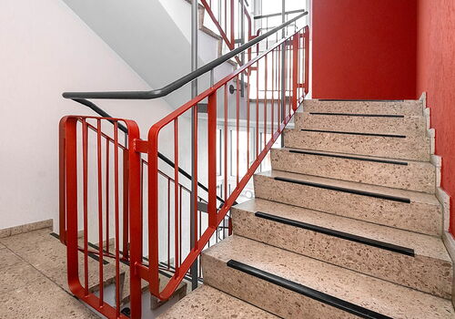 - Sanierung und Farbgestaltung des gesamten Treppenhauses sowie des Metallgeländers. Farbbeschichtung nach entsprechendern Vorbereitungsarbeiten