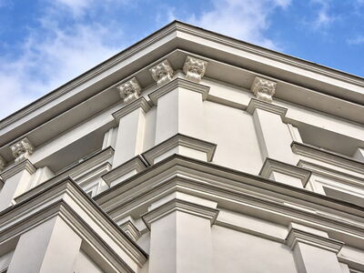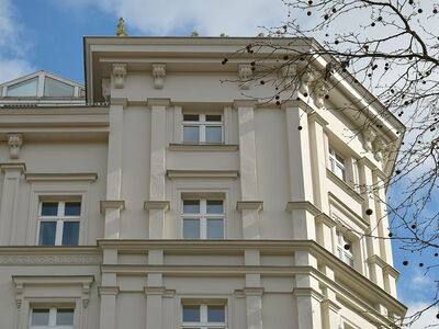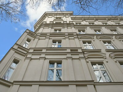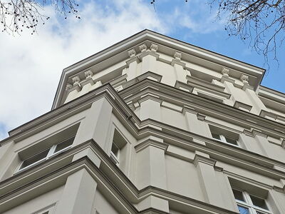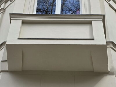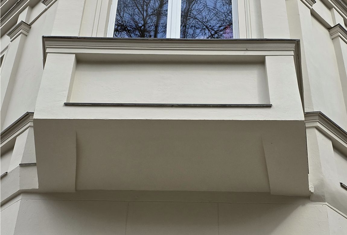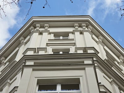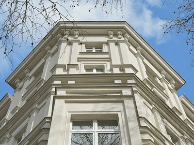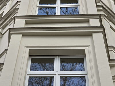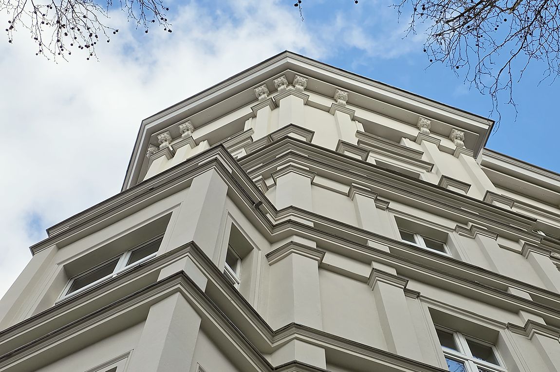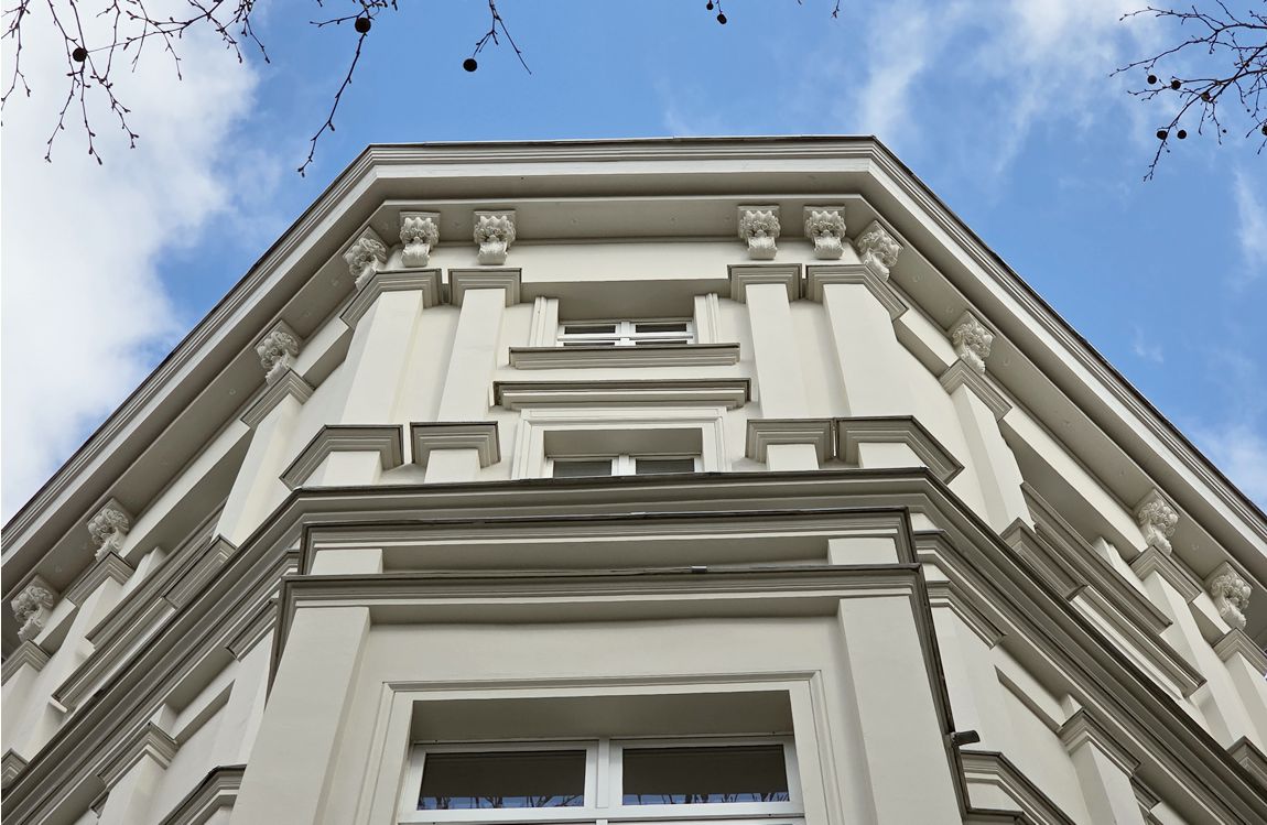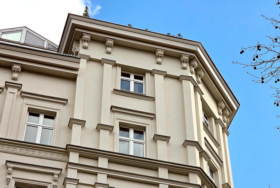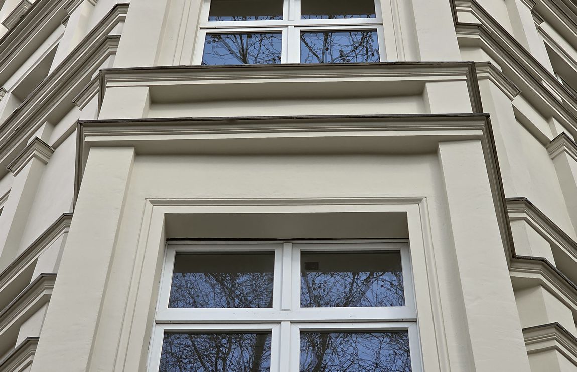Besonderes Augenmerk lag auf der sauberen Herausarbeitung von Kanten, Übergängen und Profilen, die das Erscheinungsbild eines Berliner Altbaus wesentlich prägen. Durch eine präzise handwerkliche Ausführung entstand eine ruhige, hochwertige Oberfläche, die die klassische Fassadenarchitektur des Gebäudes wieder deutlich hervorhebt.