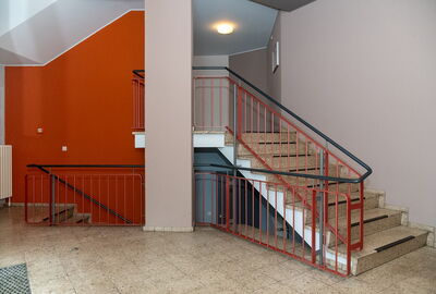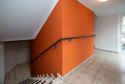Farbgestaltung des gesamten Treppenhauses sowie des Metallgeländers. Farbbeschichtung mit entsprechender Vorbereitung und malermäßige Überarbeitung des Eingangsbereiches.